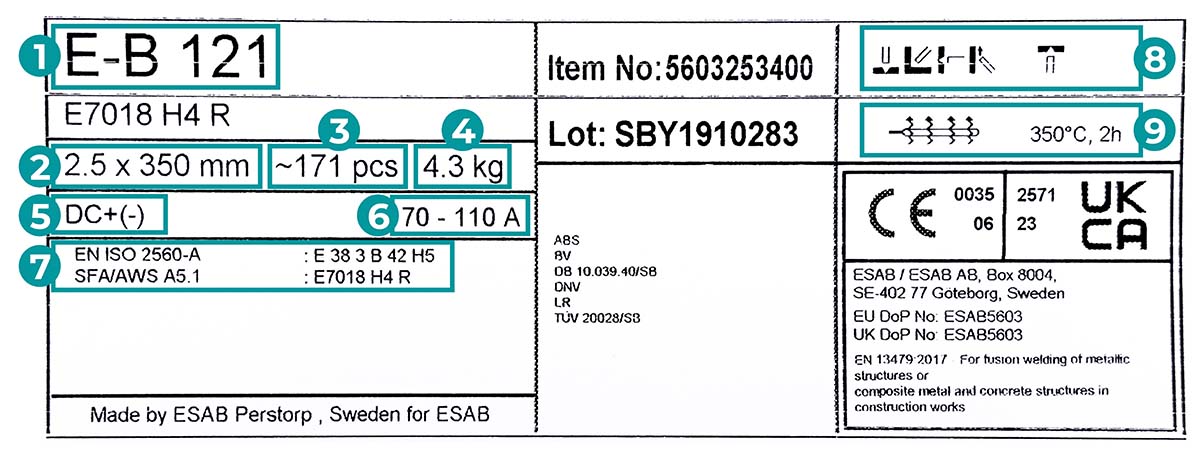 Každý výrobce preferuje jiné označení např. Esab E-B - Elektroda Bázická, E-R - elektroda rutilová, OK 46.00, OK 48.00, ...