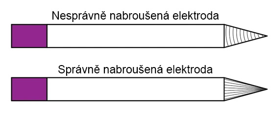 Správné broušení elektrody probíhá podélně proti směru brusného kotouče! Při příčném broušení dochází k vybroušení rýh, které vedou k omezení svařovacího proudu, nestabilitě oblouku, případnému vtroušení částic wolframu do svarové koupele.