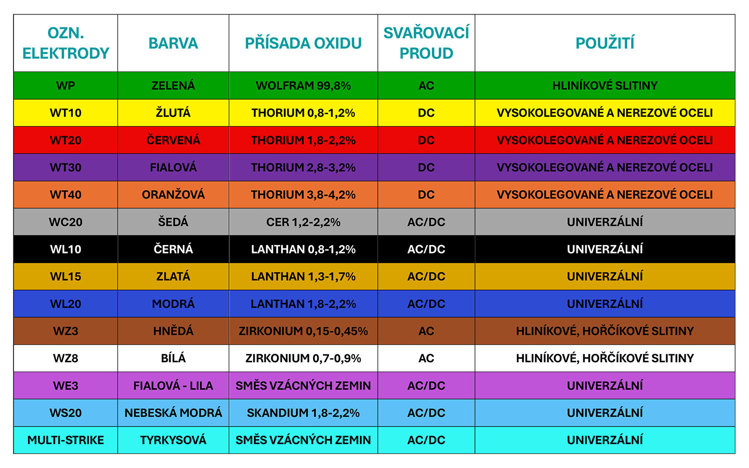 Jsou univerzální a velmi oblíbené. Po jednoduchém přebroušení můžete přejít ze svařování hliníkové slitiny ke svařování oceli, nerezu nebo titanu a vaše svary nebudou omezovány výběrem správné barvy elektrody!