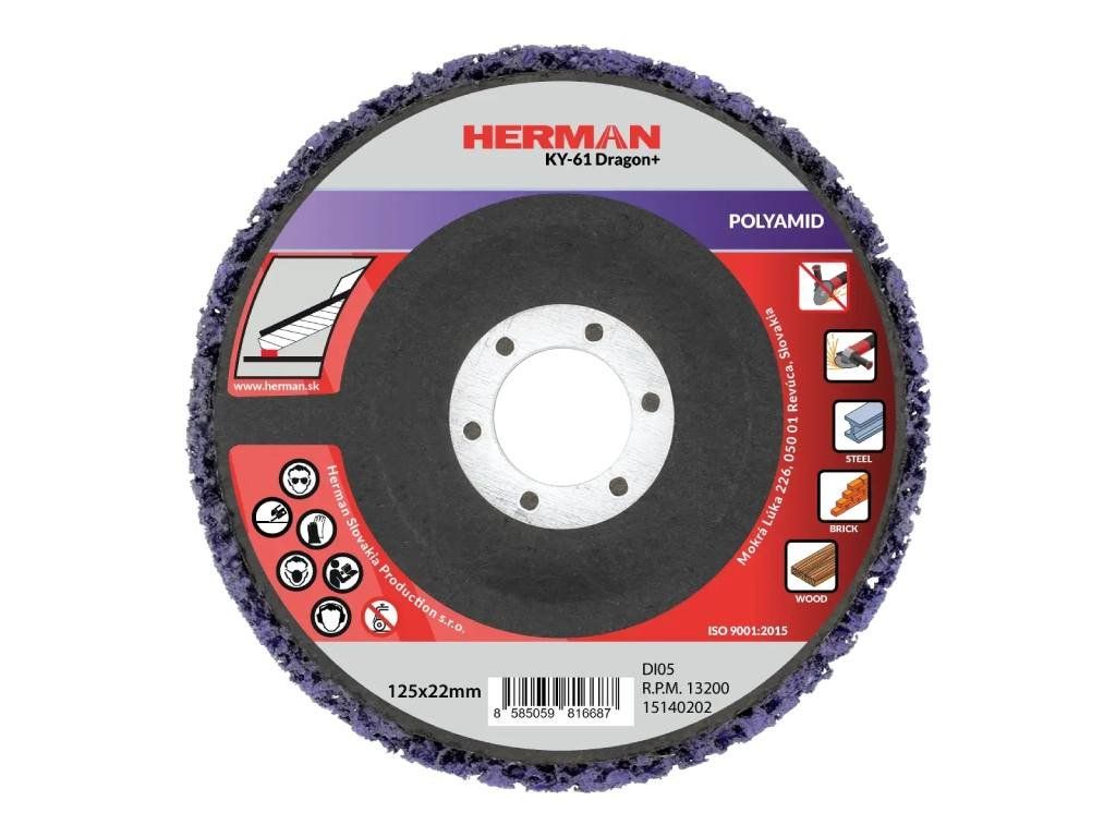 Čistící brusný kotouč HERMAN KY-61 Dragon 125 mm -Kompaktní a mimořádně agresivní čistící kotouč určený pro rychlé odstraňování rzi a hrubých nečistot z různých povrchů. Díky své konstrukci je ideální pro náročné čistící práce s úhlovou bruskou.