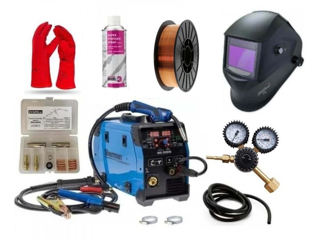 Mega set svářečka MIG 200HD Sherman + příslušenství určený pro svařování oceli a neželezných kovů. Možnost zvaření drátem (MIG/MAG), elektrodou (MMA) a netavící se elektrodou (TIG škrtem). Při změně polarizace lze svařovat i trubičkovým (trubkovým) drátem bez použití plynu.