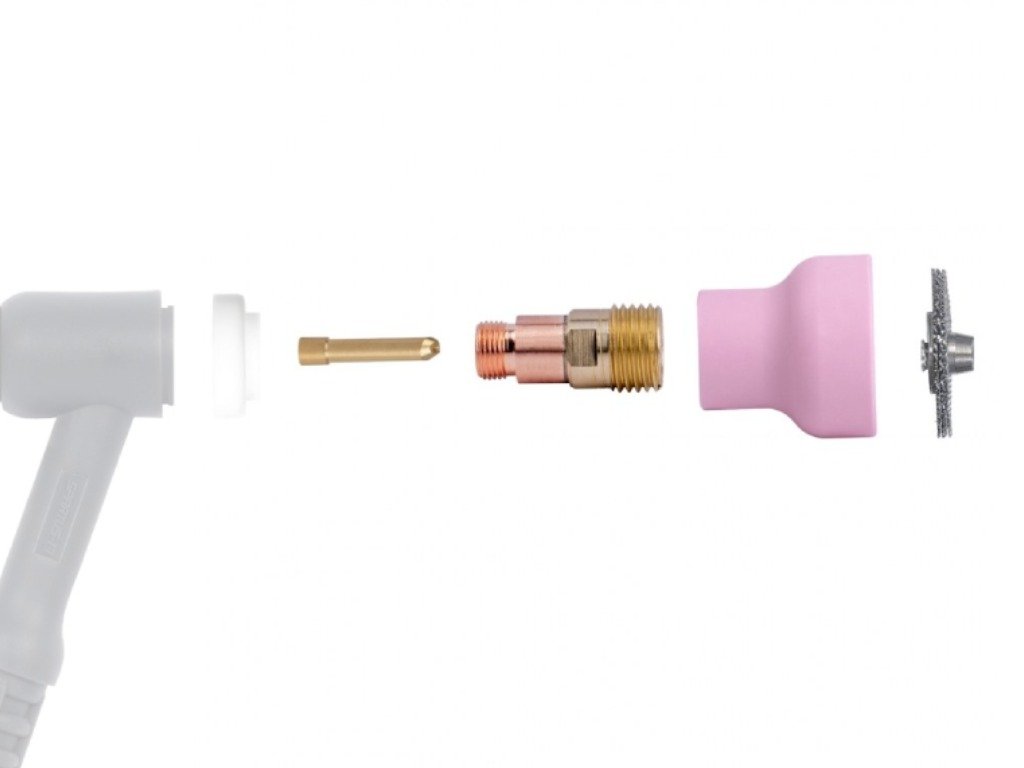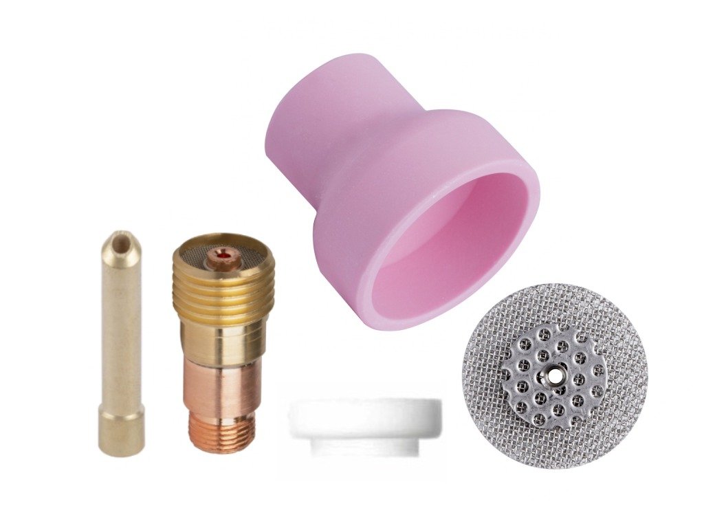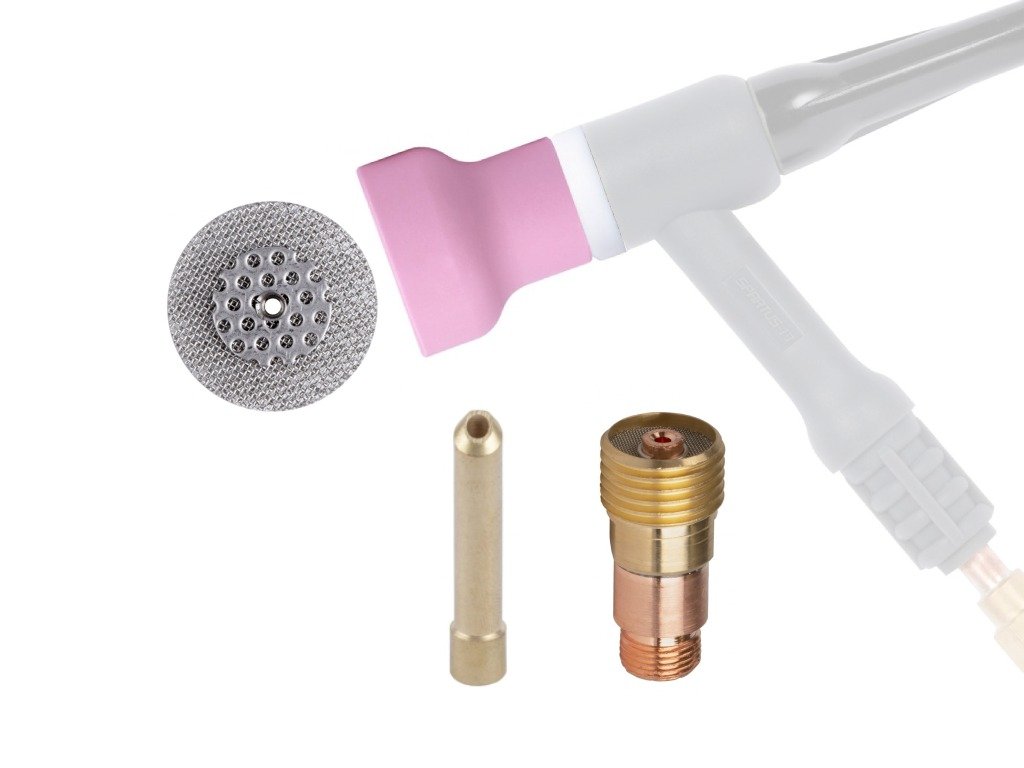 Sada CUPSYSTEM 2,4 mm / #16 na TIG hořáky 17/18/26. Keramická plynová hubice spolu s přesnými sítky v sadě CUPSYSTEM umožňuje rovnoměrné rozložení ochranného plynu během svařování. To je obzvláště důležité pro dosažení dokonalého spojení kovu.